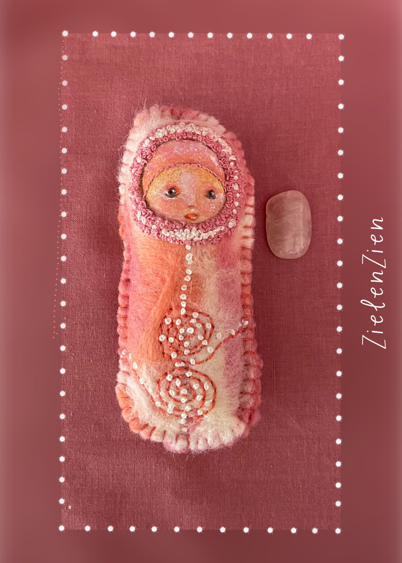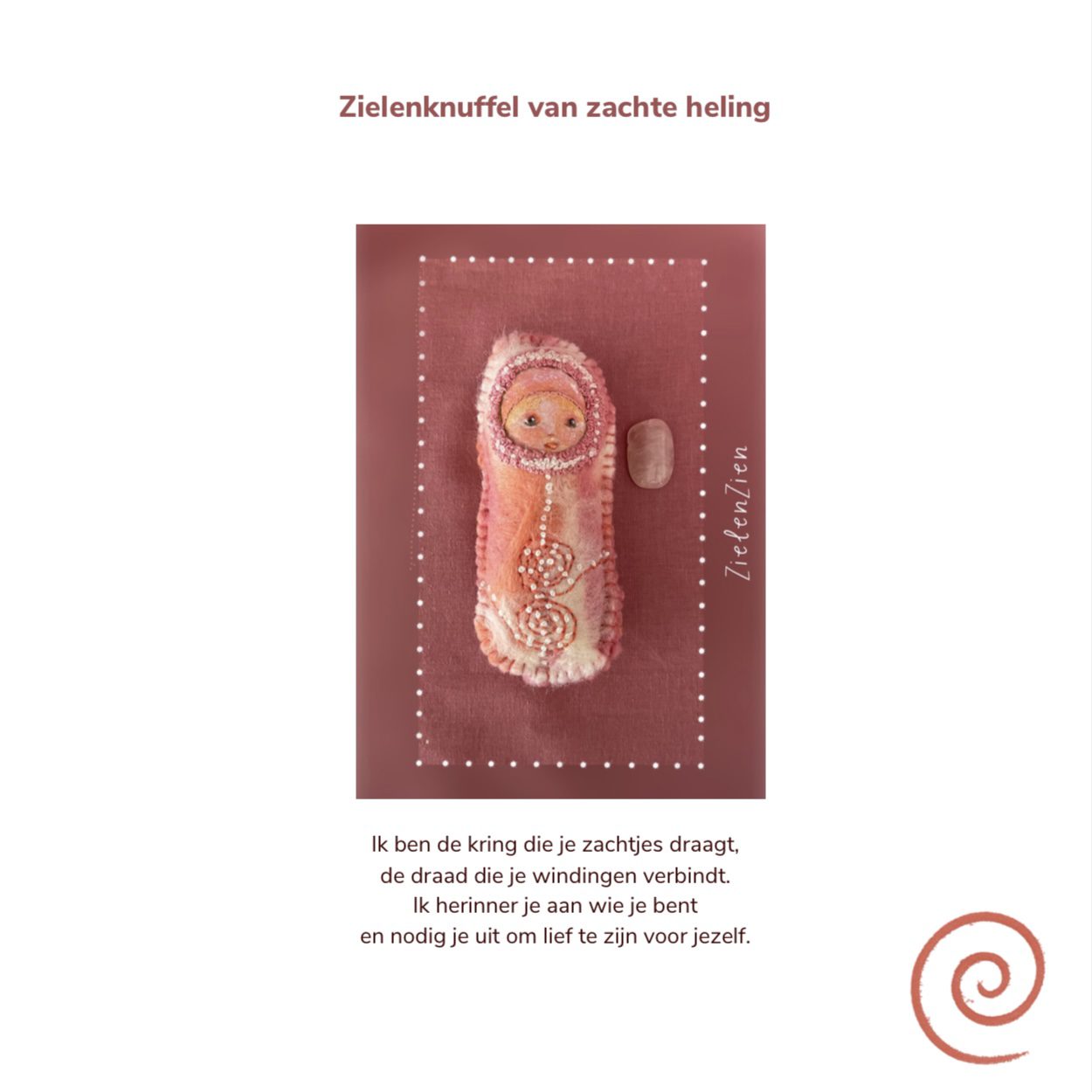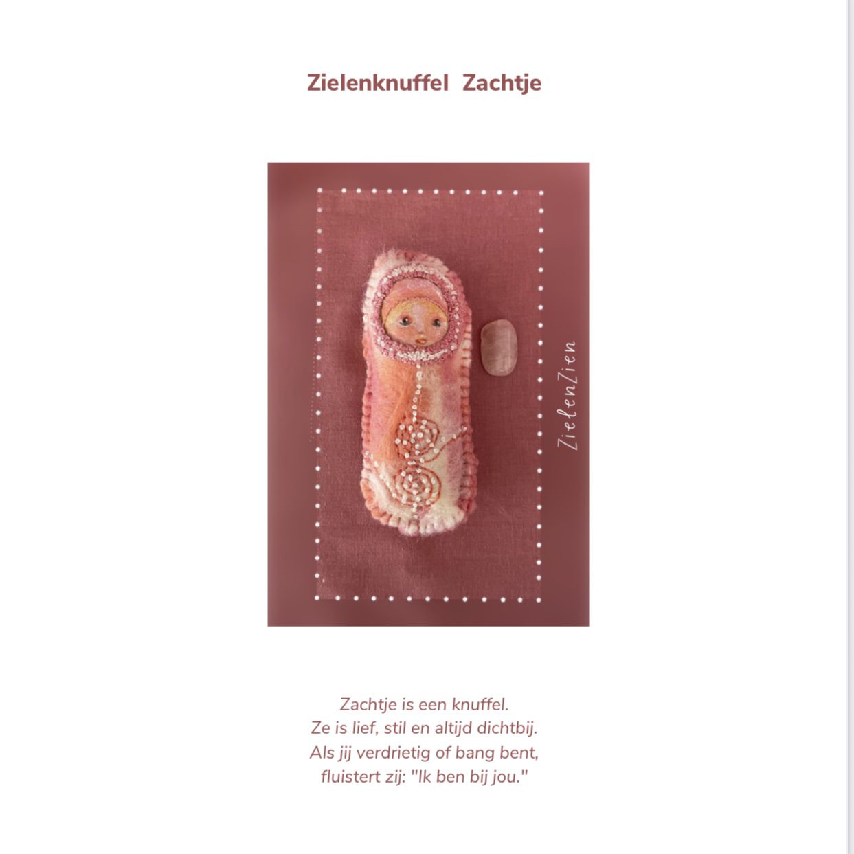 Zachtje is een echte handgemaakte zielenknuffel van wolvilt, gevuld met 100% katoen en met een handgeschilderd gezichtje op een linnen cirkeltje van 3,5 cm. In haar rugzakje draagt ze een klein edelsteentje.