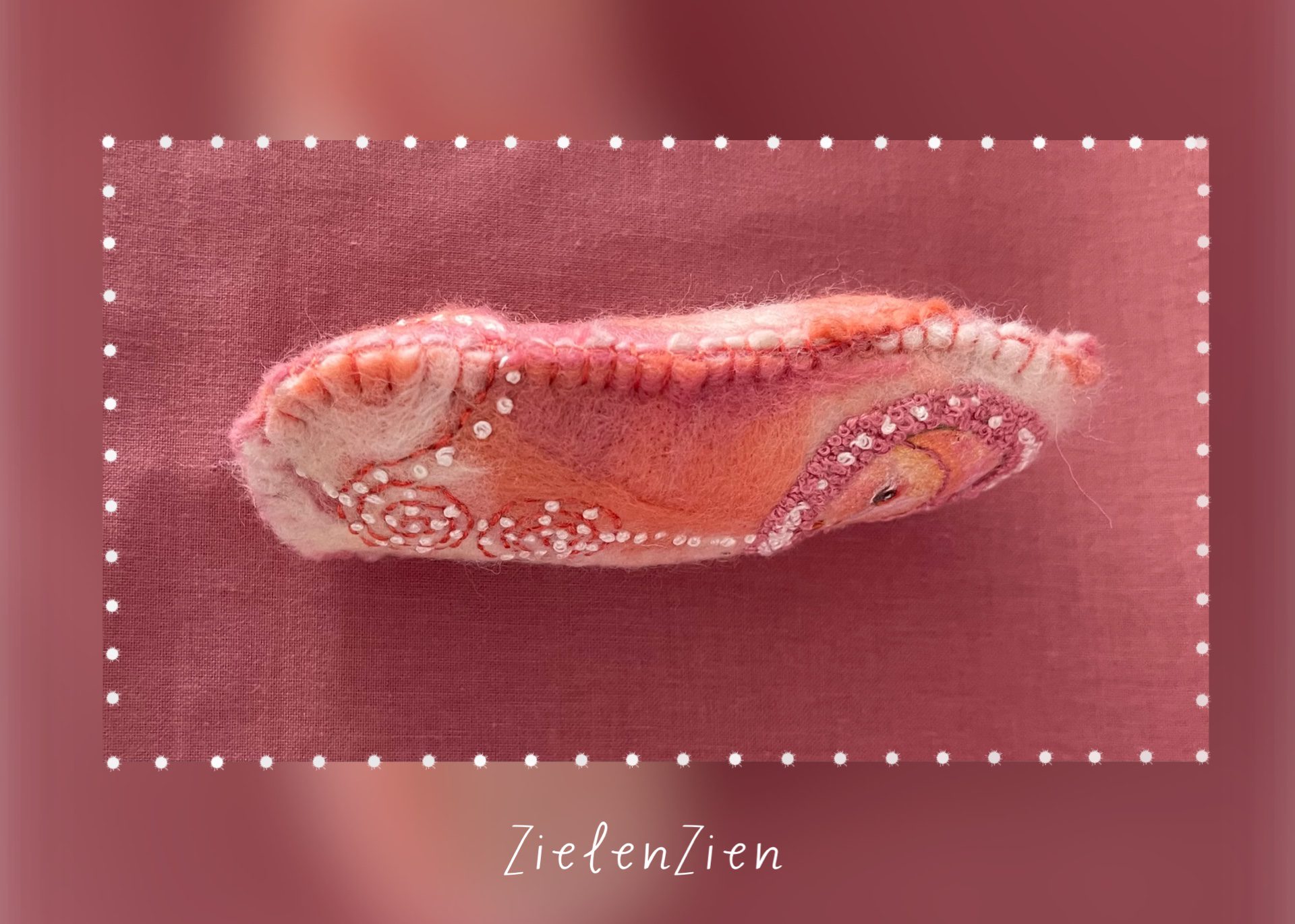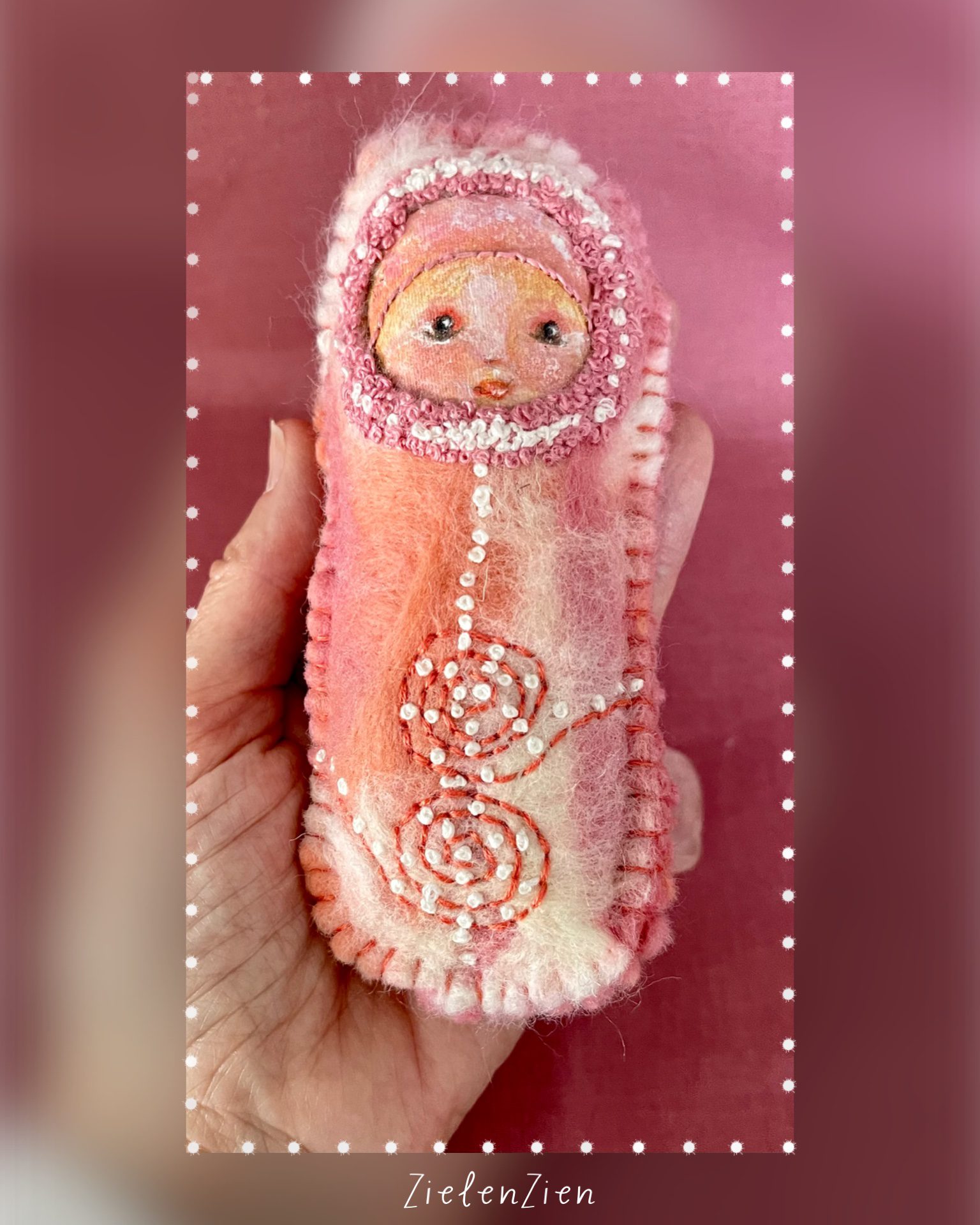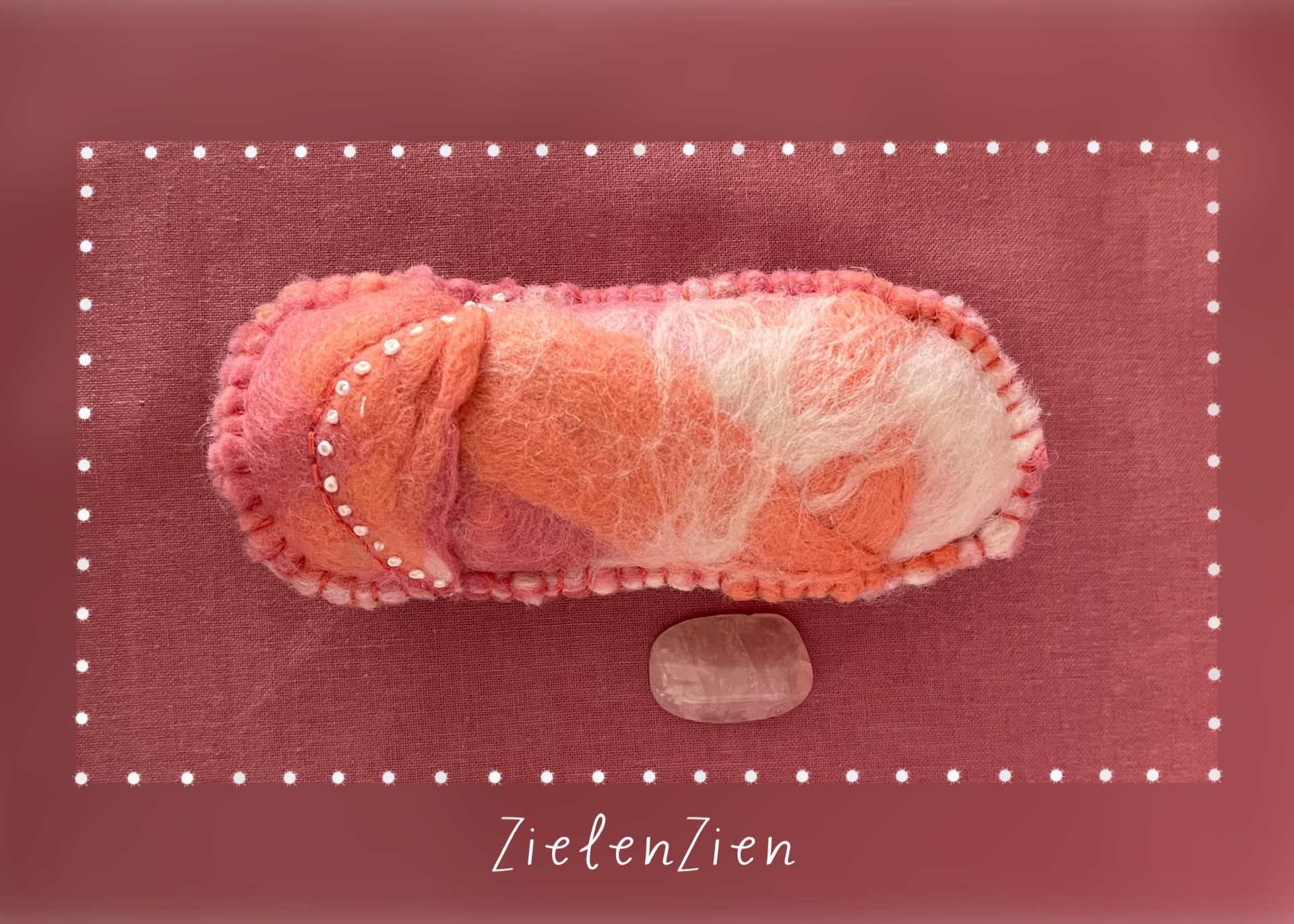 Zachtje is een echte handgemaakte zielenknuffel van wolvilt, gevuld met 100% katoen en met een handgeschilderd gezichtje op een linnen cirkeltje van 3,5 cm. In haar rugzakje draagt ze een klein edelsteentje.
